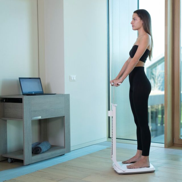 L’impedenziometro di 3° generazione visualizza l’analisi della composizione corporea, evidenziando 10 parametri: acqua totale, massa magra, massa grassa, grasso viscerale, sia a livello complessivo che segmentale.